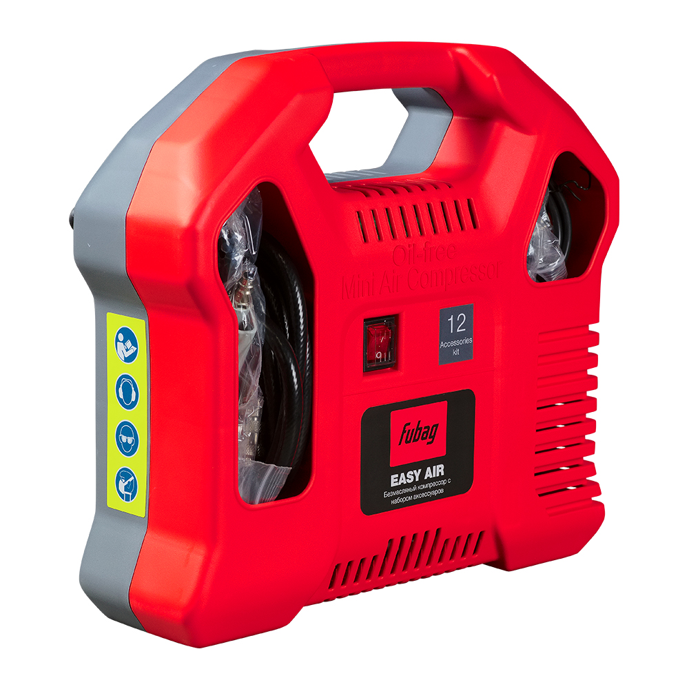Компактный набор FUBAG Easy Air для работы со сжатым воздухом. Набор FUBAG Easy Air — это мобильный комплект на базе коаксиального безмасляного компрессора (без ресивера). Он обеспечивает подачу чистого сжатого воздуха для накачки шин, спортивного инвентаря, продувки и очистки. Благодаря компактной конструкции и исполнению в виде чемодана, комплект удобен для перевозки и хранения.