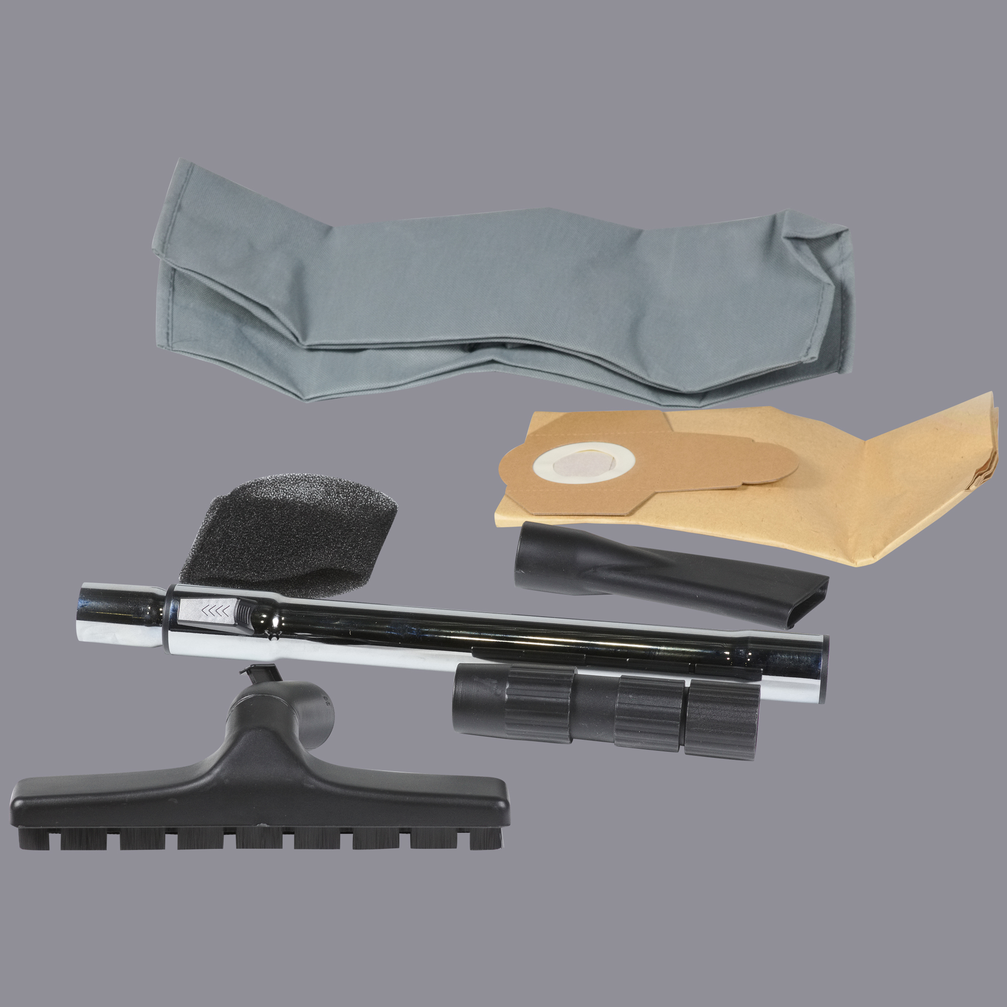 • Бумажный одноразовый мешок • Тканевый многоразовый мешок • Фильтр тонкой очистки HEPA • Фильтр для влажной уборки • Пластиковый гофрошланг • Трубка составная • Насадка универсальная • Насадка щелевая • Колесо 4 шт. • Комплект адаптеров для подключения к электроинструменту